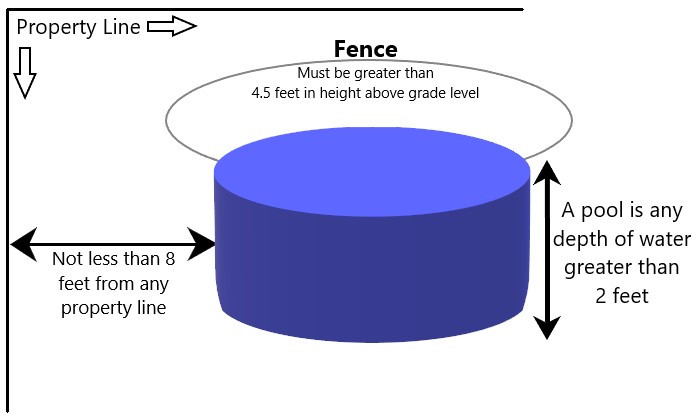 All pools having a depth of more than two feet must be fenced in. The fence and gate shall be at least four and one half feet (4 1/2) in height above the grade level and shall be constructed of a minimum of number 9 gauge wire or similar material or a wooden fence. Gates shall be equipped with self-closing and self-latching devices placed at the top of the gate.